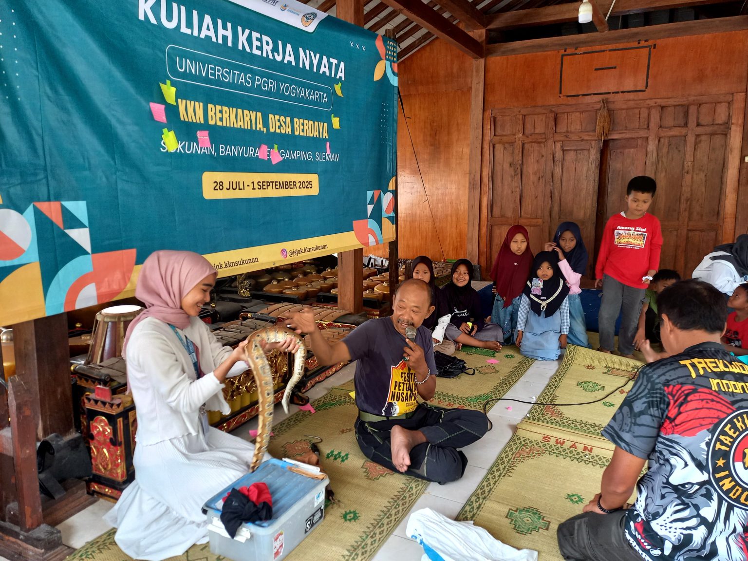 Sleman – Mahasiswa Kuliah Kerja Nyata (KKN) Universitas PGRI Yogyakarta (UPY) kelompok 7 menggelar program edukasi lingkungan bertajuk “Sahabat Peduli Alam dan Bumi” (SAPA BUMI) bagi santri Taman Pendidikan Al-Qur’an di Pendhapa Kekandhangan Banyuraden, Sabtu (9/8/2025). Kegiatan ini memadukan pengetahuan ekologi ular dengan nilai-nilai keislaman tentang pelestarian alam.